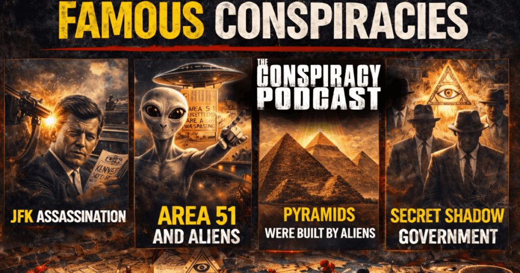 We’ve spent years on The Conspiracy Podcast diving into these stories, pulling them apart, laughing at the absurd parts, and then getting weirdly quiet when something actually makes sense. So here’s our rundown of the most famous conspiracy theories that have captivated millions of people around the world.